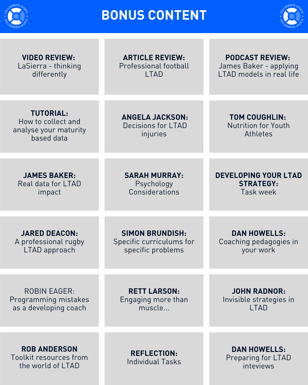 Each month, you will meet with your mentor to have a live group-based discussion of the key topics below to help shape your approach to LTAD in your environment!